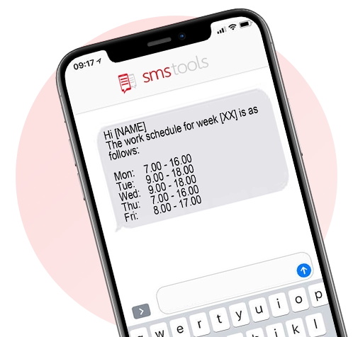 Smstools ti consente di automatizzare i turni di lavoro via SMS. Inviare turni giornalieri, cancellazioni, appuntamenti di lavoro o cambiamenti di rotta è semplice e veloce con il nostro software. Questo può permetterti di risparmiare molto tempo e lavoro.